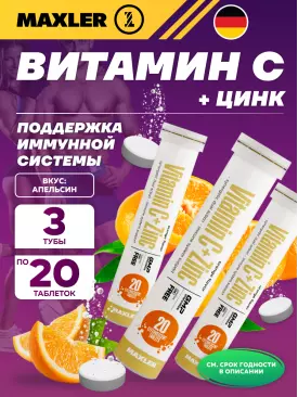-10% 930 q 1 033 q 1 033 q 000 Витамин С Vitamin C + Zinc Effervescent Tablets 3 х 20 таб MAXLER В корзину Артикул 39965