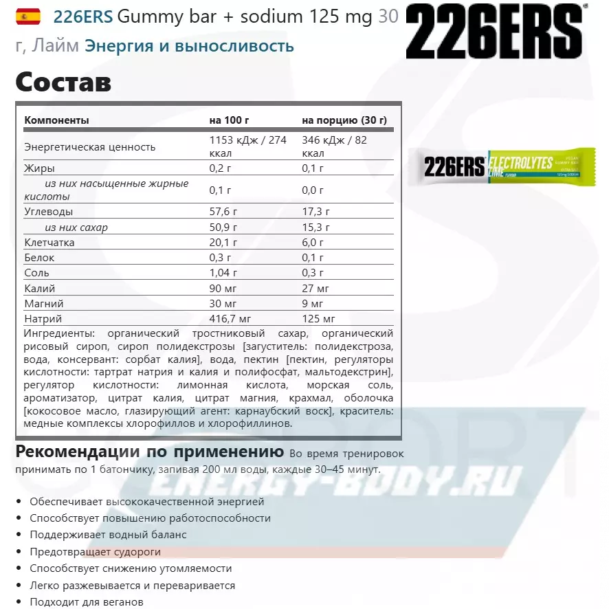 Gummy bar + sodium 125 mg 30 г, Лайм