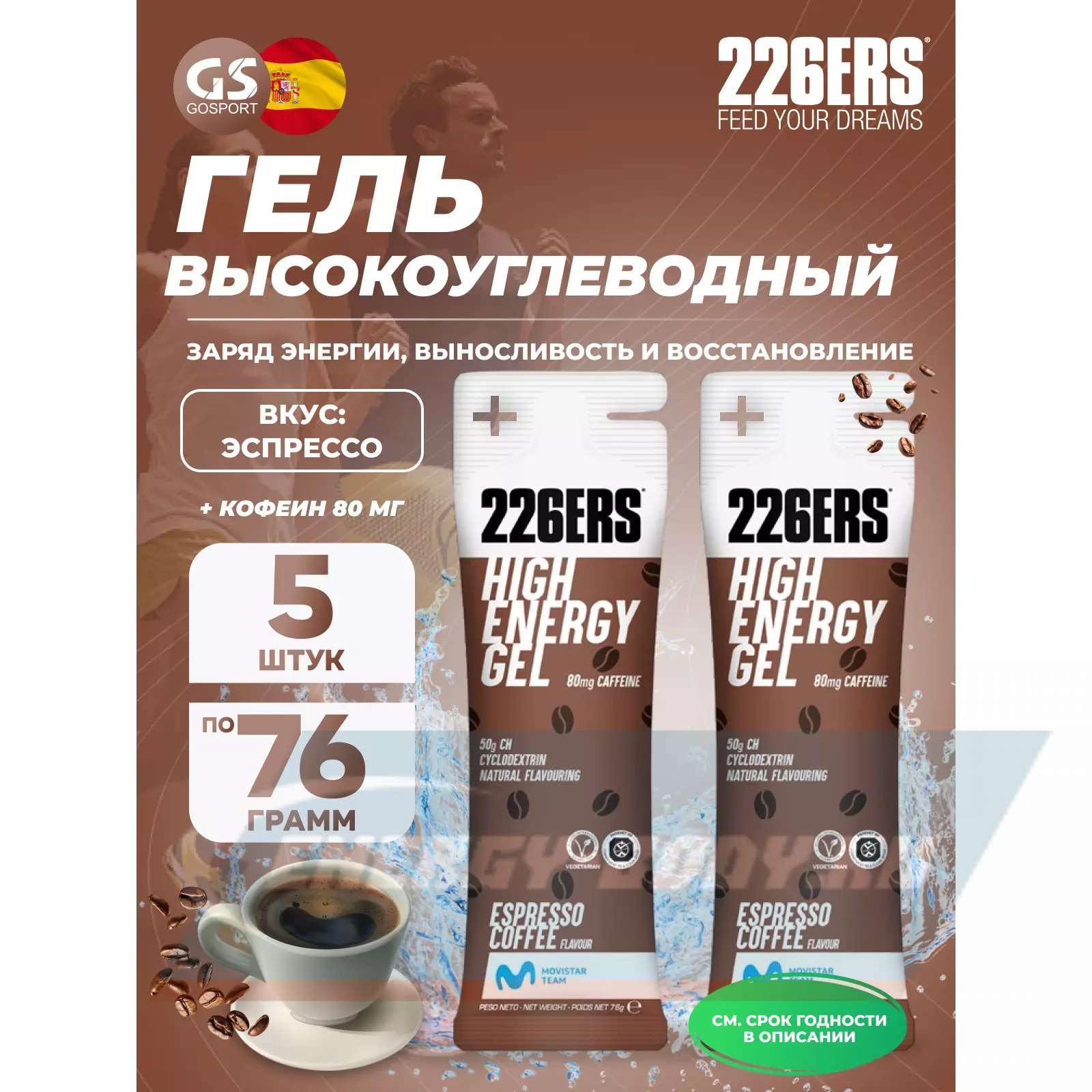 226ERS High Energy Gel + caffeine 80 mg 5 x 76 г, Эспрессо — Заряд энергии и повышение выносливости