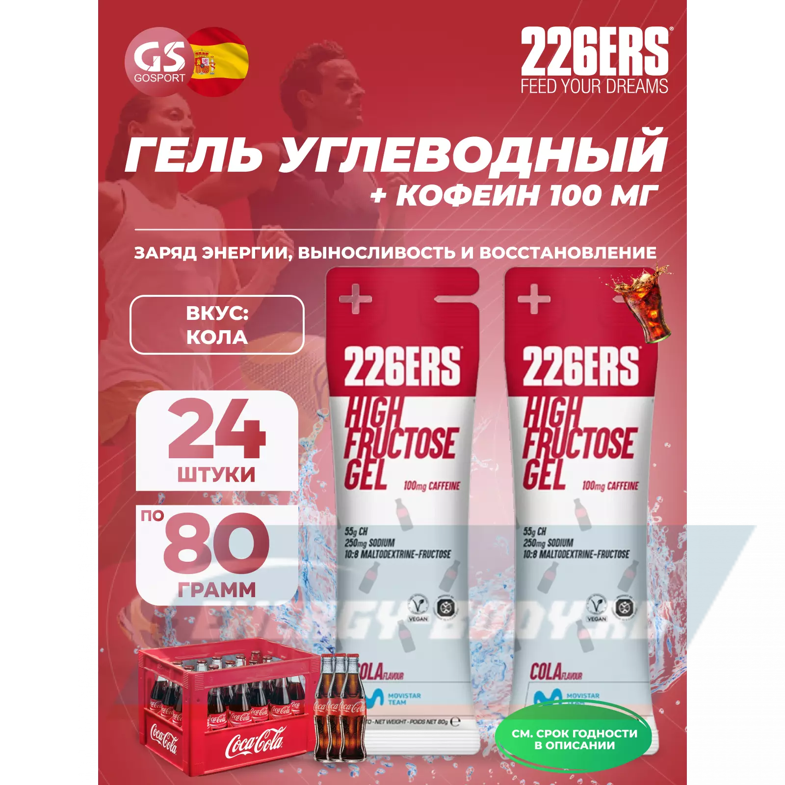 226ERS High Fructose Gel 250 mg + caffeine 100 mg 24 x 80 г, Кола — Заряд энергии и выносливость