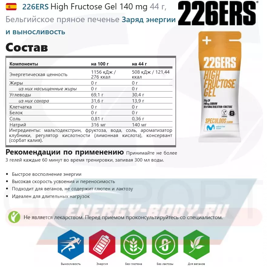 226ERS High Fructose Gel 140 mg 44 г, Бельгийское пряное печенье — Заряд энергии и выносливость