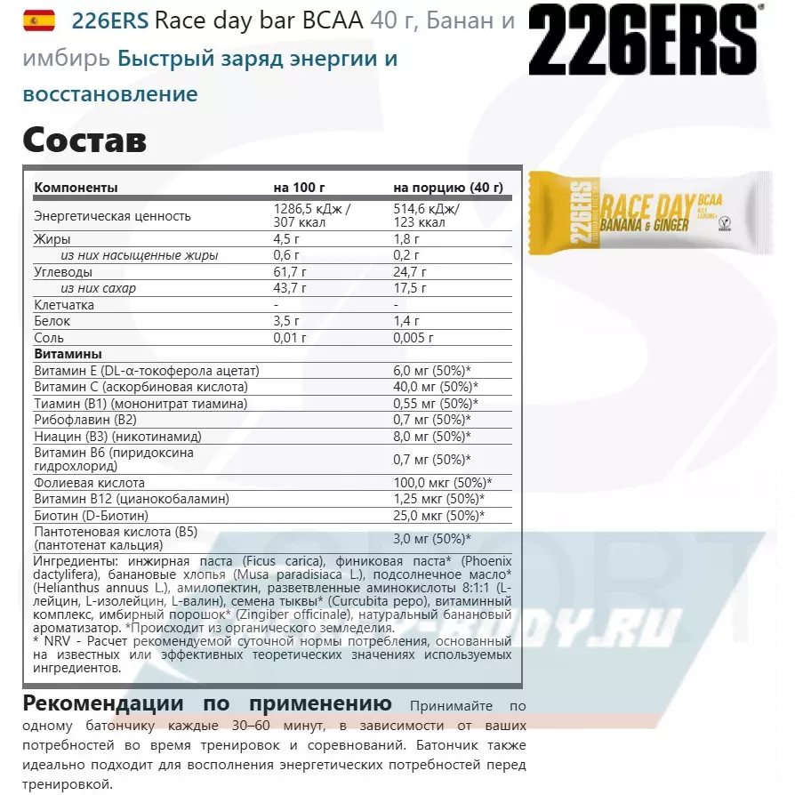 226ERS Race day bar BCAA 40 г, Банан и имбирь — Быстрый заряд энергии и восстановление