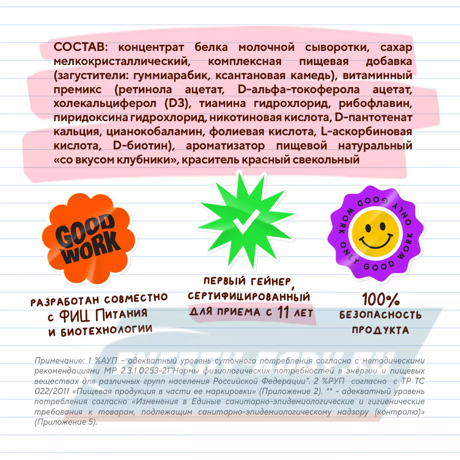 Ингредиенты: концентрат белка молочной сыворотки, сахар мелкокристаллический, комплексная пищевая добавка (загустители: гуммиарабик, ксантановая камедь), витаминный премикс (ретинола ацетат, D-альфа-токоферола ацетат, холекальциферол (D3), тиамина гидрохлорид, рибофлавин, пиридоксина гидрохлорид, никотиновая кислота, D-пантотенат кальция, цианокобаламин, фолиевая кислота, L-аскорбиновая кислота, D-биотин), ароматизатор пищевой натуральный «со вкусом клубники».