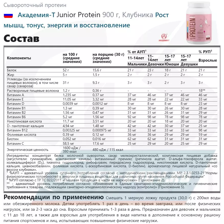 Академия-Т Junior Protein 900 г, Клубника — Рост мышц, тонус, энергия и восстановление