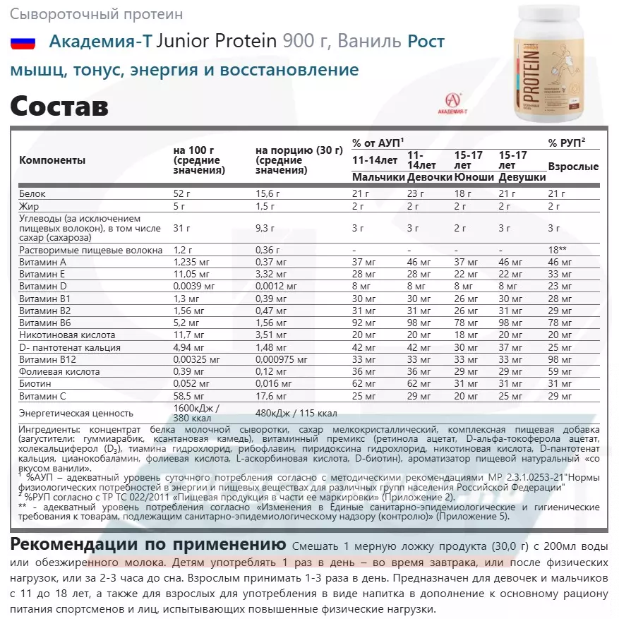 Академия-Т Junior Protein 900 г, Ваниль — Рост мышц, тонус, энергия и восстановление