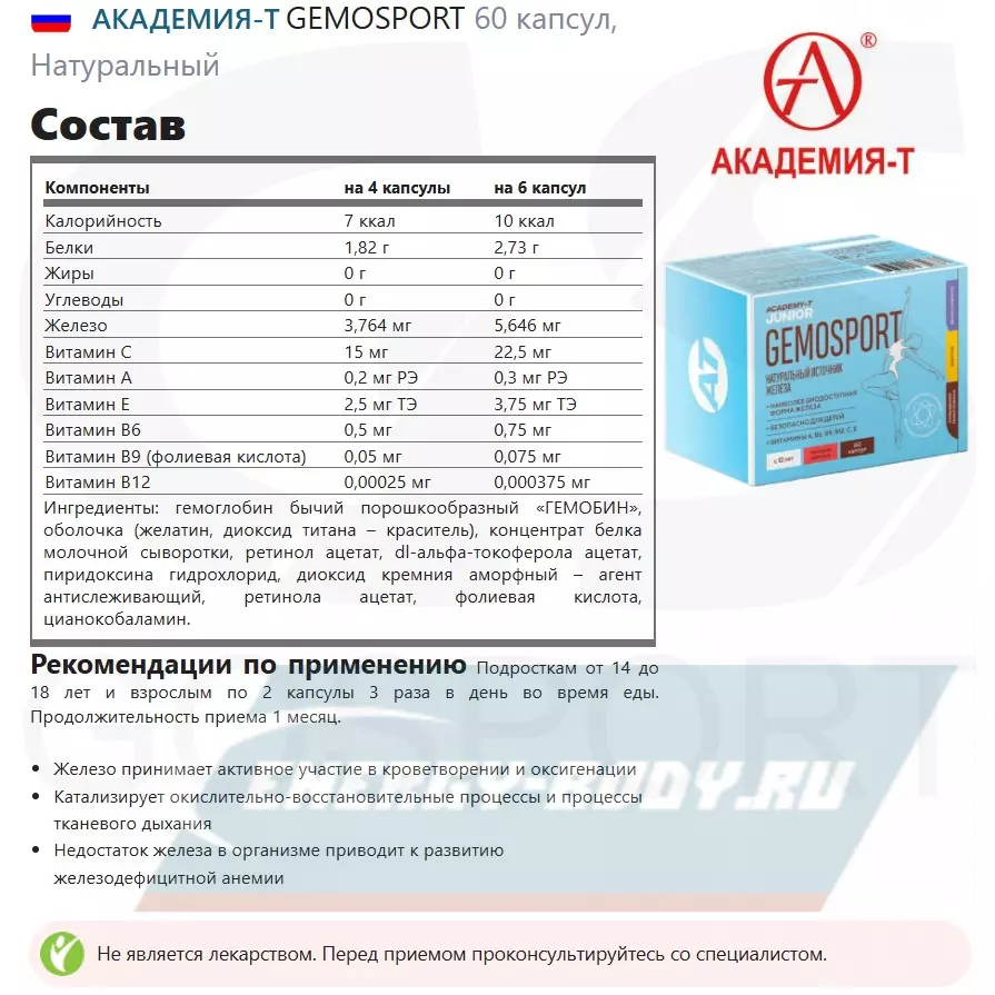 GEMOSPORT® — комплексная биологически активная добавка к пище, способствующая повышению уровня гемоглобина и профилактике железодефицитных состояний и анемии.
