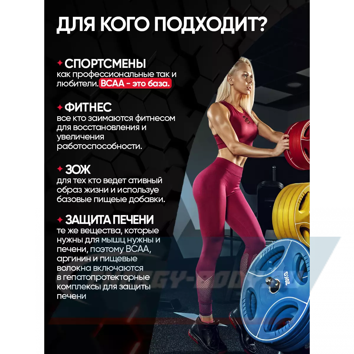 - быстро устранить дефицит ВСАА и восстановить энергопотенциал белковых клеток в послетренировочный период, когда включается механизм восстановления и начинается активный рост мышечной массы;