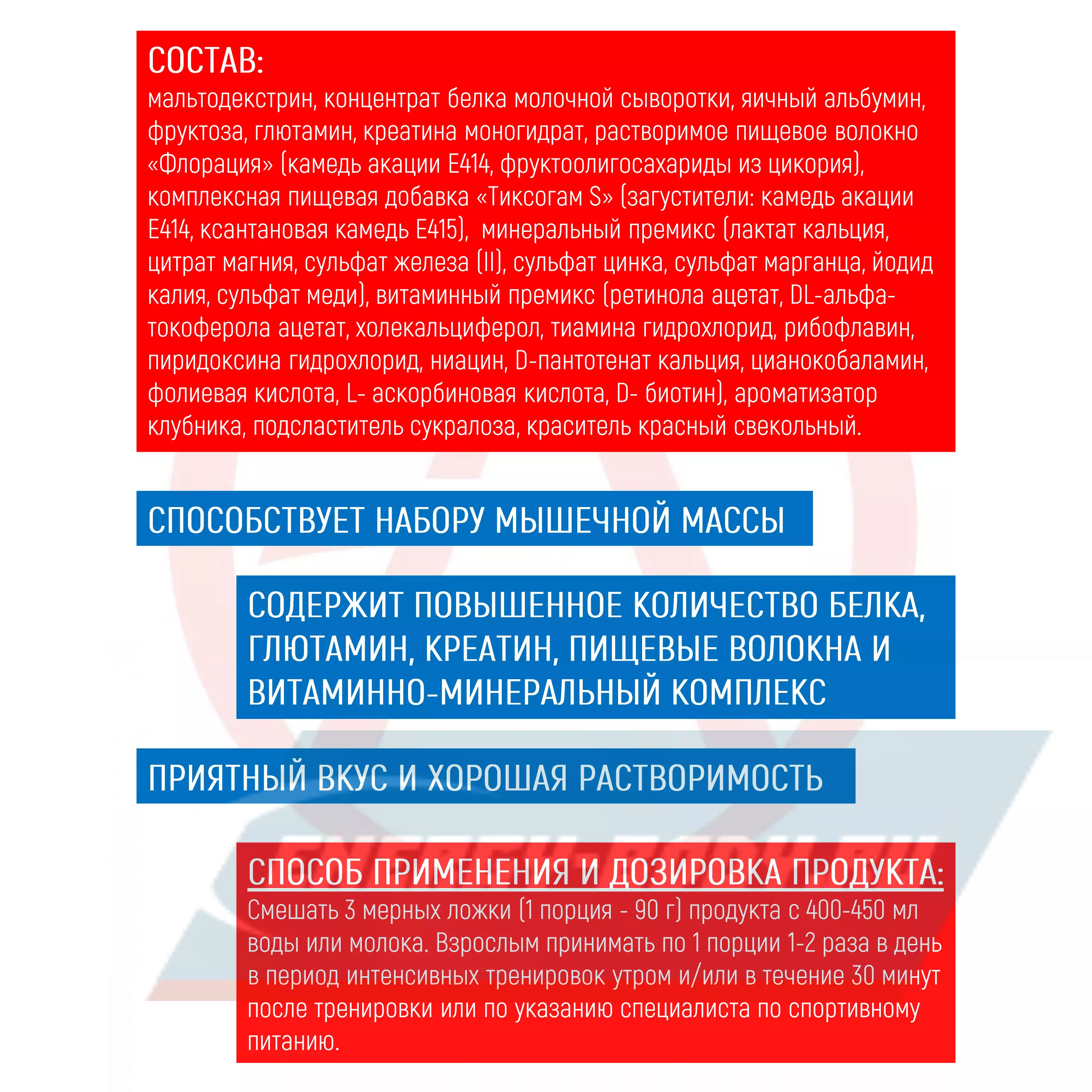 Простые (фруктоза) и сложные (мальтодекстрин, флорация) углеводы в составе SPORTEIN GAINER обеспечивают энергией организм на протяжении всего времени тренировки, а специально разработанный витаминно-минеральный комплекс содержит высокие концентрации всех необходимых для ускоренного наращивания мышечной массы витаминов и минеральных веществ в нужных пропорциях.