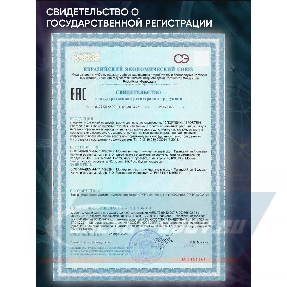 SPORTEIN Enriched Protein разработан российскими учеными в результате трехлетних научных исследований, проведенных на кафедре Технологии продуктов детского, функционального и спортивного питания Московского государственного университета прикладной биотехнологии.SPORTEIN® Enriched Protein одобрен и сертифицирован Федеральной службой по надзору в сфере защиты прав потребителей и благополучия человека Министерством здравоохранения и социального развития РФ.SPORTEIN® Enriched Protein создает все необходимые условия для естественной работы мышц и их максимальной отдачи, повышает выработку энергии, существенно укрепляет защитные функции организма и расширяет пределы адаптационных возможностей спортсменов.