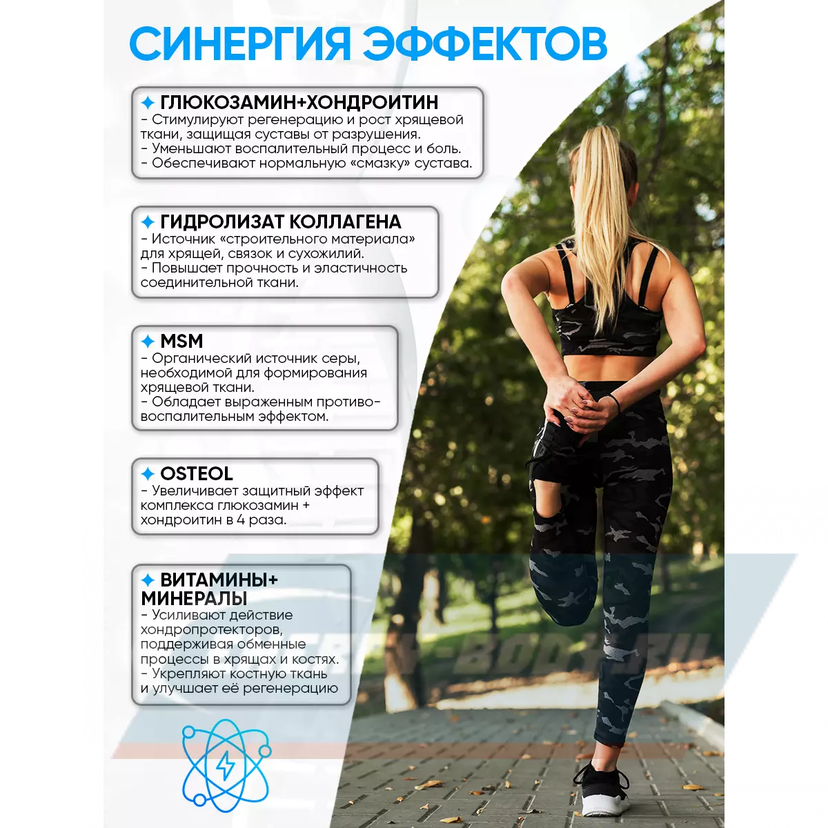 Ингредиенты: глюкозамина сульфат, гидролизат коллагена, белки молочной сыворотки «Остеол», метилсульфонилметан, хондроитин сульфат, витаминно-минеральный комплекс (карбонат кальция, оксид магния, сульфат меди, сульфат марганца, аскорбиновая кислота, DL-альфа-токоферола ацетат, биотин, холекальциферол, пиридоксина гидрохлорид, носитель мальтодекстрин), оболочка капсулы (желатин, краситель диоксид титана).