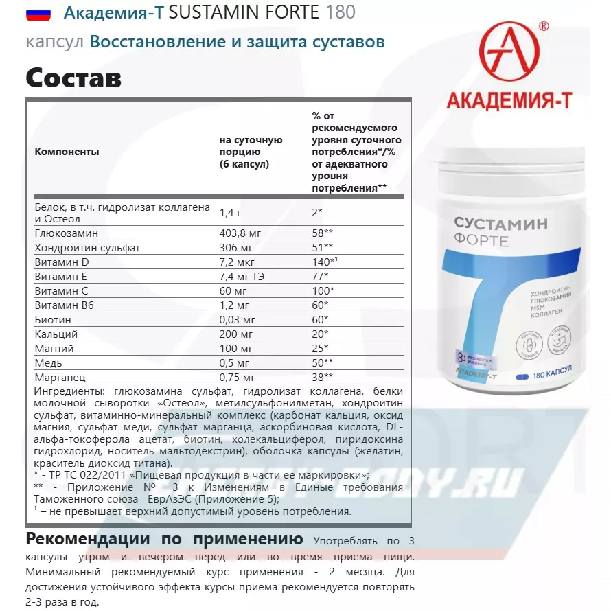 СУСТАМИН® ФОРТЕ - сбалансированный натуральный продукт нового поколения для профилактики и лечения заболеваний суставно-связочного аппарата. Содержит уникальную комбинацию хондропротективных веществ, обладающих взаимоусиливающим эффектом и оказывающим комплексное корректирующее действие на метаболизм хрящевой и костной ткани. Способствует восстановлению элементов опорно-двигательного аппарата после различных травм.