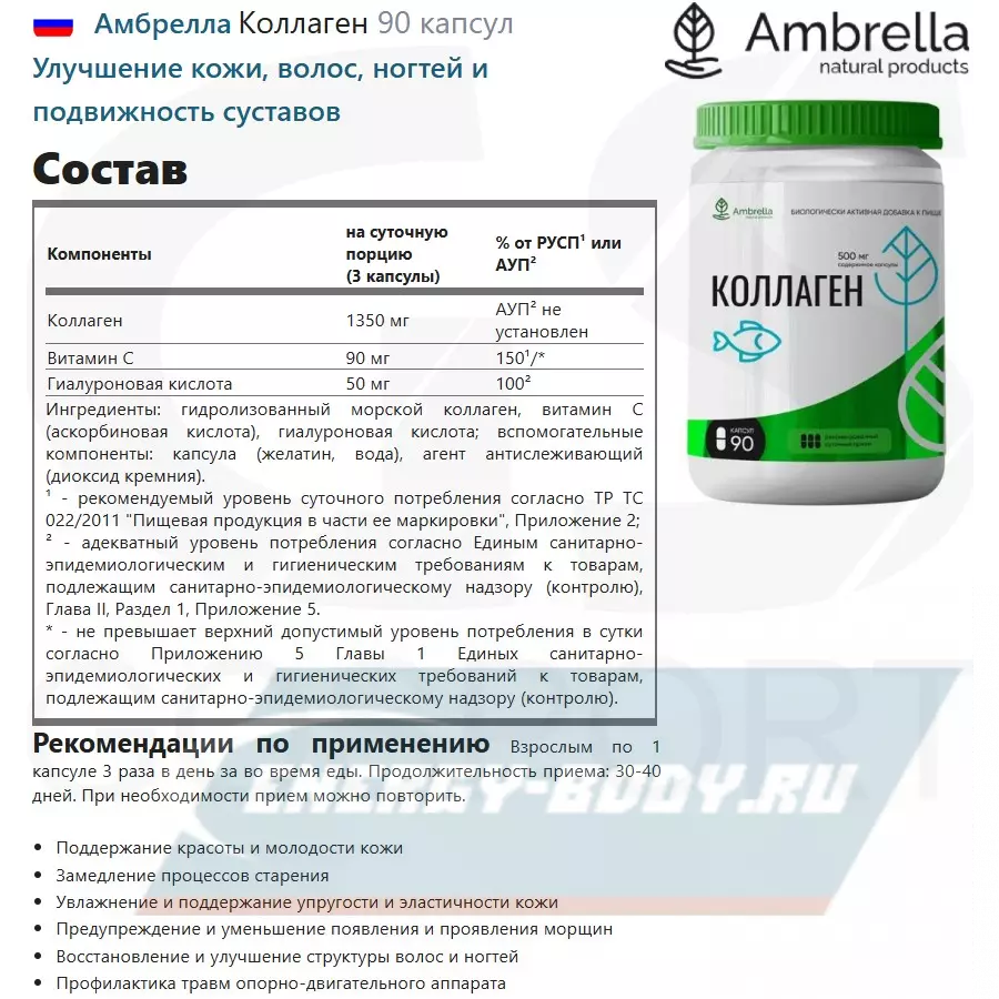 Амбрелла Коллаген 90 капсул — Улучшение кожи, волос, ногтей и подвижность суставов