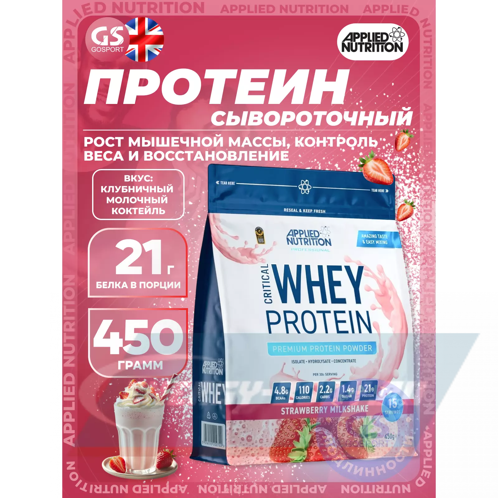 APPLIED NUTRITION CRITICAL Whey 450 г, Клубничный молочный коктейль — Рост мышечной массы, контроль веса и восстановление