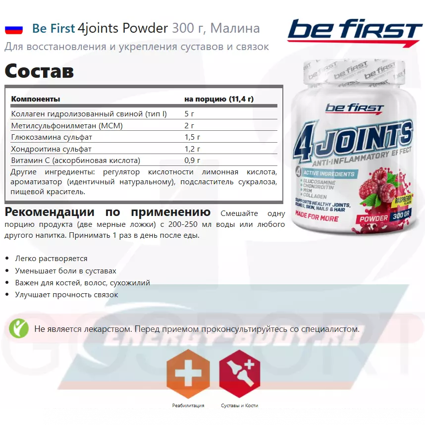 Be First 4joints Powder – комплекс натуральных веществ, предназначенных для питания, восстановления и укрепления суставов, связок, соединительных тканей. Активными компонентами комплекса являются глюкозамина сульфан, хондроитина сульфан, гидролизованный коллаген (тип I), метилсульфонилметан (MSM) в правильном соотношении. Смесь усилена витамином С для синтеза коллагена и обладает приятным вкусом. Комплекс легко размешивается в шейкере в воде или соке.