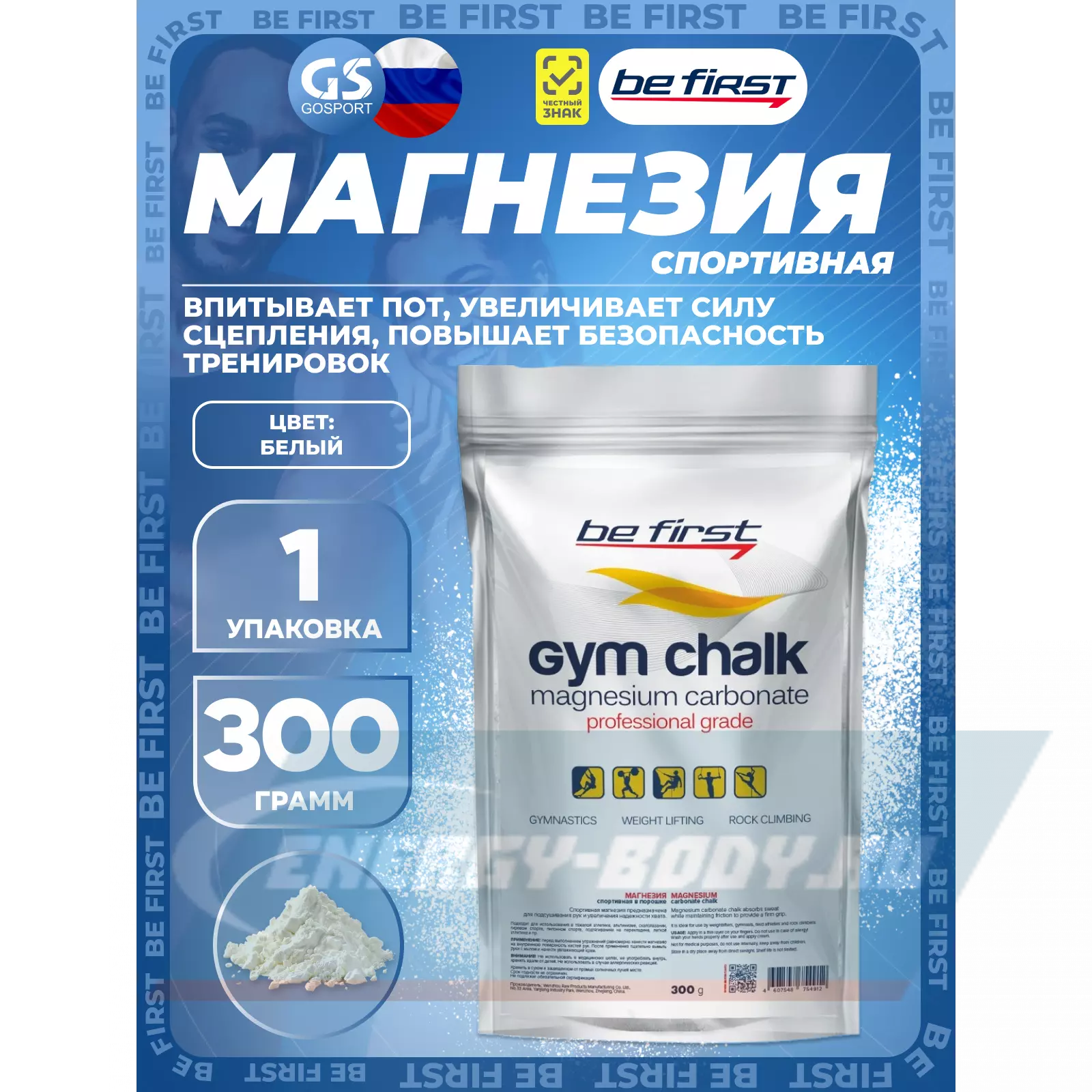 Новая магнезия от Be First в новой экономичной упаковке! Магнезия позволяет эффективно подсушивать потеющие ладони, что увеличивает силу сцепления между ладонью и спортивным снарядом (грифом штанги или турником), позволяя атлету не отвлекаться на удержание снаряда в руках и больше сосредоточиться на технике выполнения упражнения. Магнезия повышает безопасность тренировок и соревнований, снижая вероятность соскальзывания ладоней. Это особенно важно в силовых видах спорта, а также в таких видах как гимнастика, полдэнс и спортивный альпинизм.