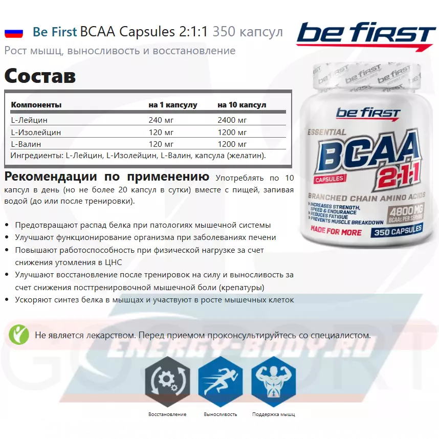 В дни тренировок рекомендуется принимать одну или две порции BCAA за 10-30 минут до тренировки и сразу после тренировки. В остальные дни рекомендуется принимать BCAA между приемами пищи. Для лучшего восстановления и с целью подавления катаболизма также рекомендуется прием BCAA перед сном и сразу после сна.Состав Be First BCAA Capsules 2:1:1