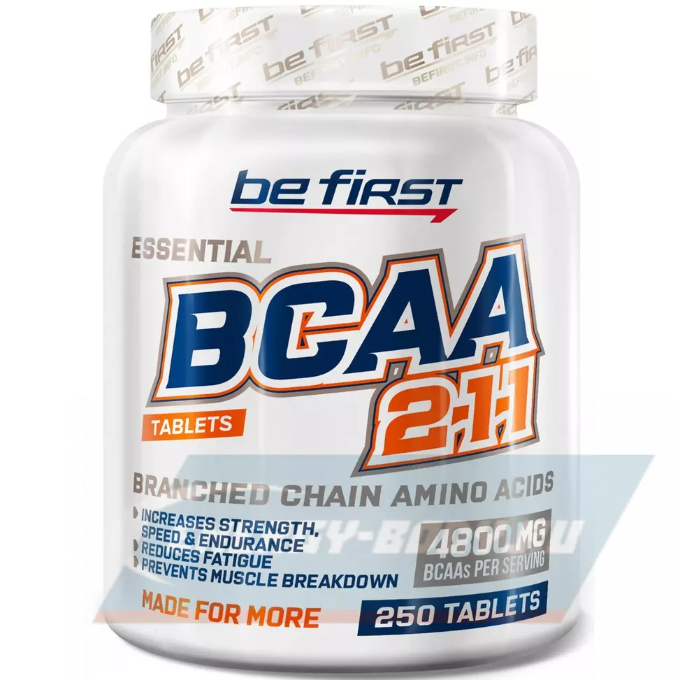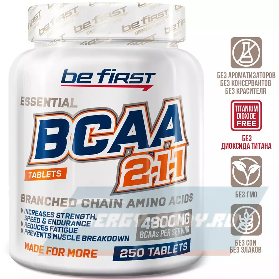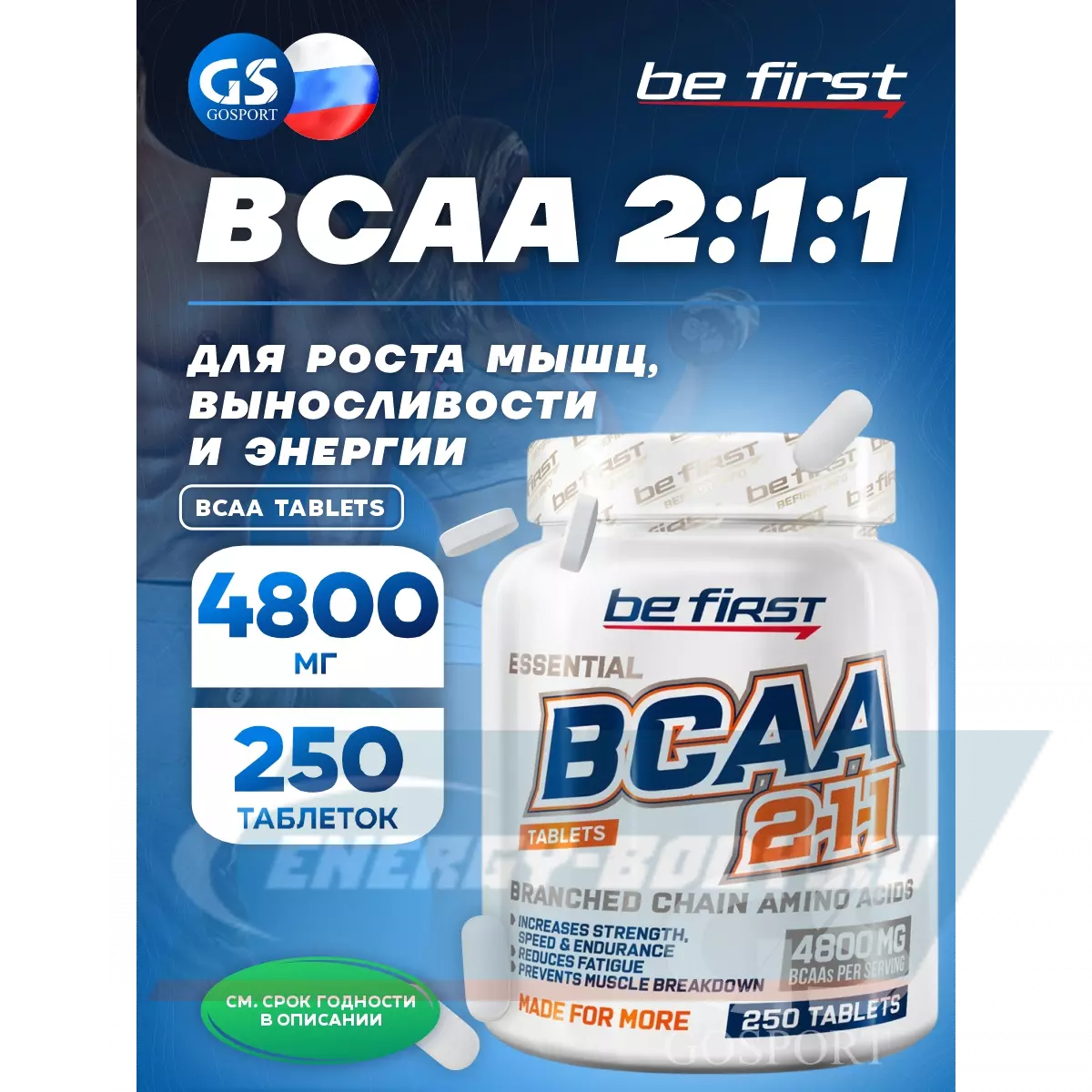 Be First BCAA 2:1:1 Tablets – аминокислотная добавка, содержащая 3 незаменимые аминокислоты с разветвленной цепью (лейцин, изолейцин, валин), и предназначенная для поддержки мышц во время силового тренинга, для ускорения их роста и повышения силовых показателей. При тренировках на рельеф и похудении BCAA тоже оказывает неоценимую помощь, сохраняя мышцы от разрушения и позволяя значительно улучшить параметры фигуры.