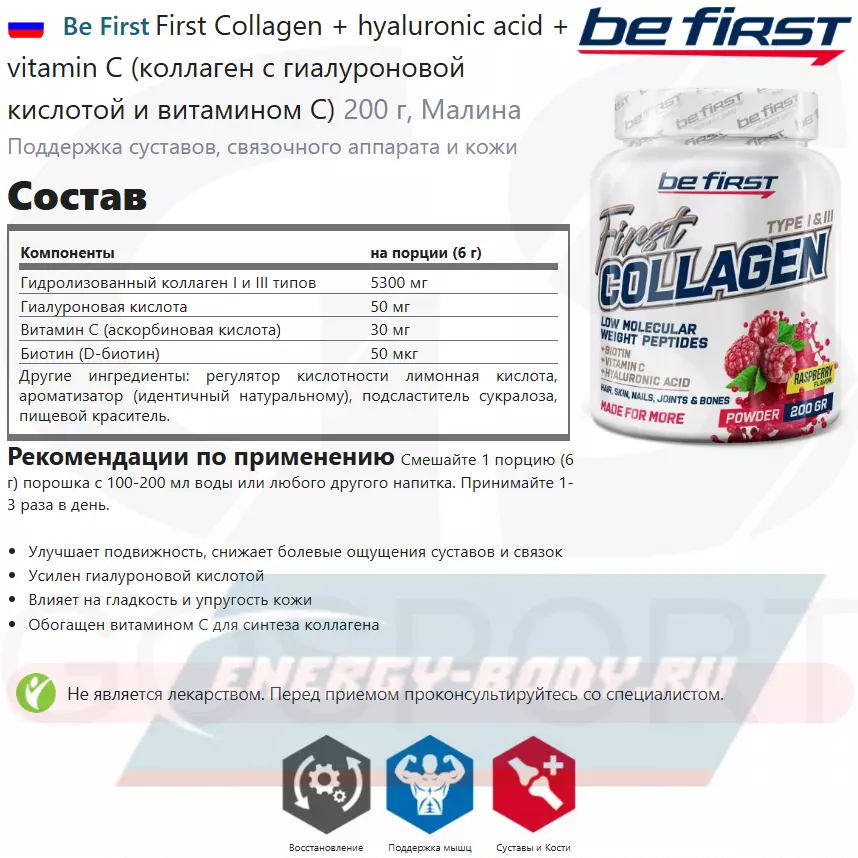 Состав Be First First Collagen + hyaluronic acid + vitamin C (коллаген с гиалуроновой кислотой и витамином С)