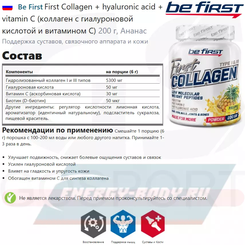 Состав Be First First Collagen + hyaluronic acid + vitamin C (коллаген с гиалуроновой кислотой и витамином С)