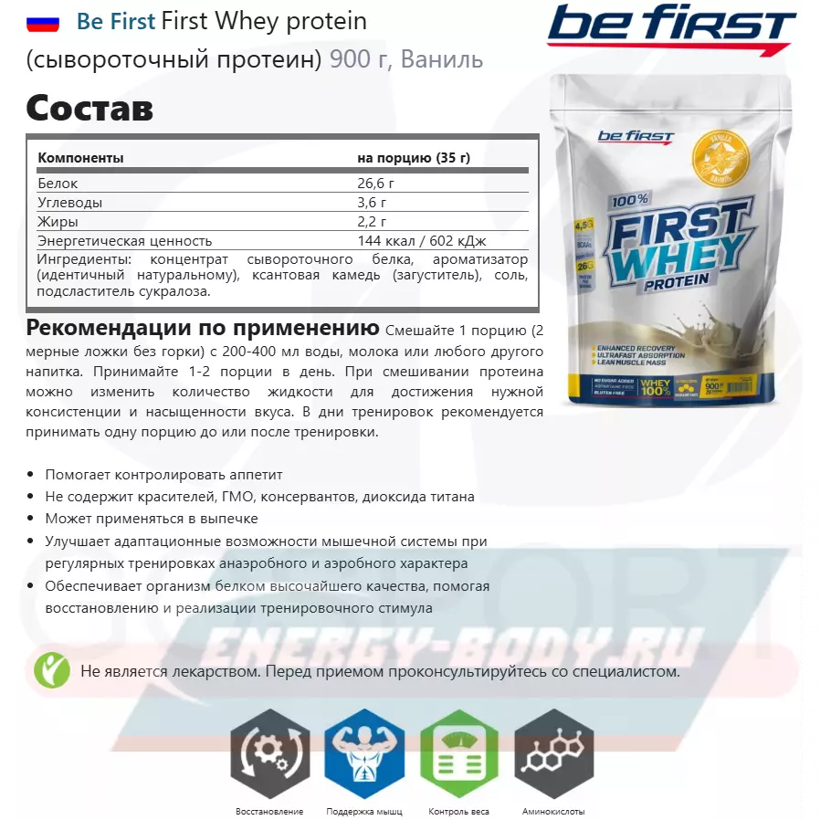 - Обеспечивает организм белком высочайшего качества, помогая восстановлению и реализации тренировочного стимула