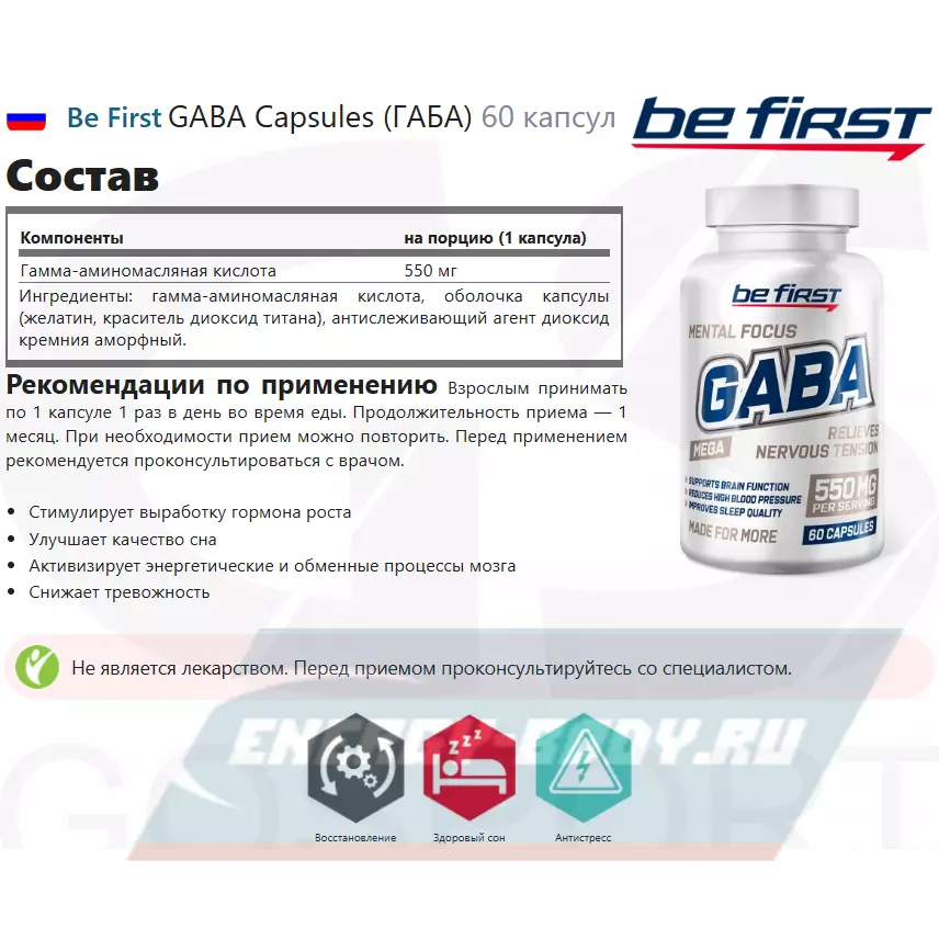 Be First GABA Capsules (ГАМК, гамма-аминомасляная кислота) – аминокислота, выполняющая роль нейромедиатора в центральной нервной системе. В спорте (и в том числе бодибилдинге) гамма-аминомасляную кислоту применяют из-за двух ее основных эффектов – тормозящего (в результате чего улучшается качество сна) и стимулирующего секрецию гормона роста (что дает лучший рост мышечной массы и уменьшение количества жира).