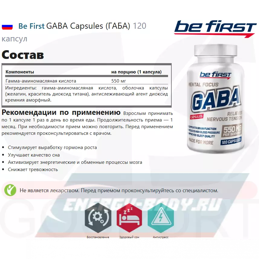 Be First GABA Capsules (ГАМК, гамма-аминомасляная кислота) – аминокислота, выполняющая роль нейромедиатора в центральной нервной системе. В спорте (и в том числе бодибилдинге) гамма-аминомасляную кислоту применяют из-за двух ее основных эффектов – тормозящего (в результате чего улучшается качество сна) и стимулирующего секрецию гормона роста (что дает лучший рост мышечной массы и уменьшение количества жира).