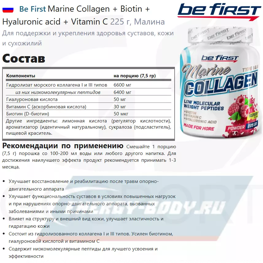 Be First Marine Collagen + Biotin + Hyaluronic acid + Vitamin C 225 г, Малина — Для поддержки и укрепления здоровья суставов, кожи и сухожилий
