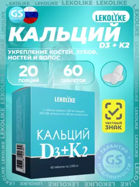 Ингредиенты: кальция хелат (бисглицинат), оболочка капсулы (желатин), диоксид кремния аморфный (антислеживающий агент), менахинон-7 (витамин К2), холекальциферол (витамин D3).