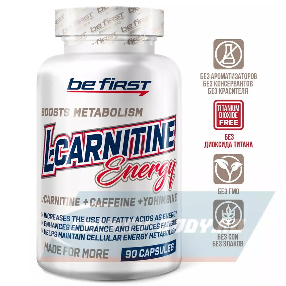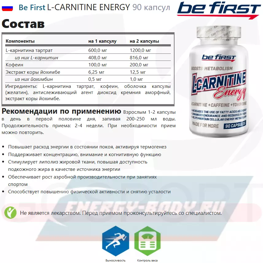 L-Carnitine Energy (Л-карнитин Энерджи) от Be First включает в себя биологически активные вещества, энергетические, липолитические и термогенические эффекты которых синергически складываются, обеспечивая многоплановое воздействие на весь организм. В результате усиливается теплопродукция, активизируется жировой обмен и расщепление жиров, повышается энергетика. Все это необходимо для создания отрицательного энергобаланса - главного условия снижения веса. При этом продукт не просто повышает уровень энергии, но и обладает способность нормализовать жировой обмен, снижая уровень общего и "плохого" холестерина.