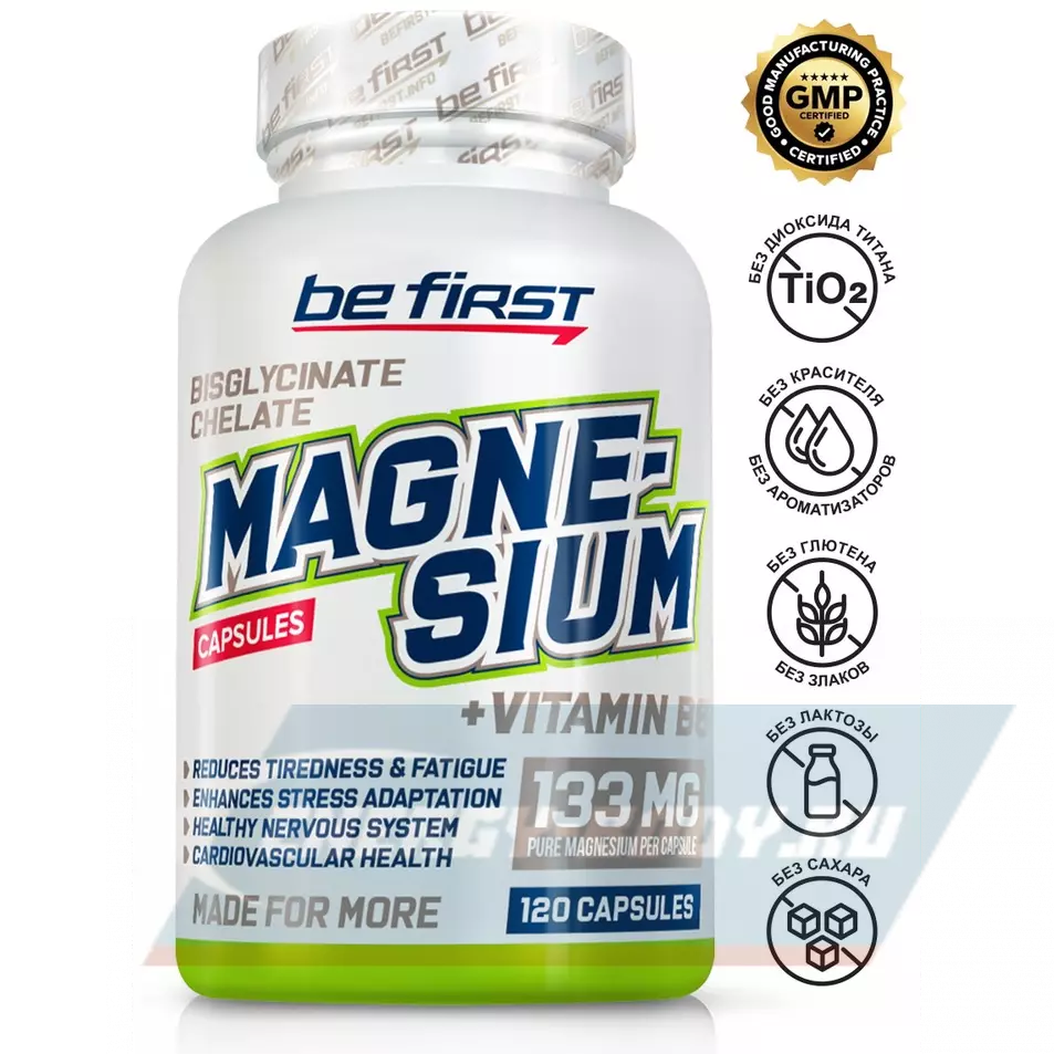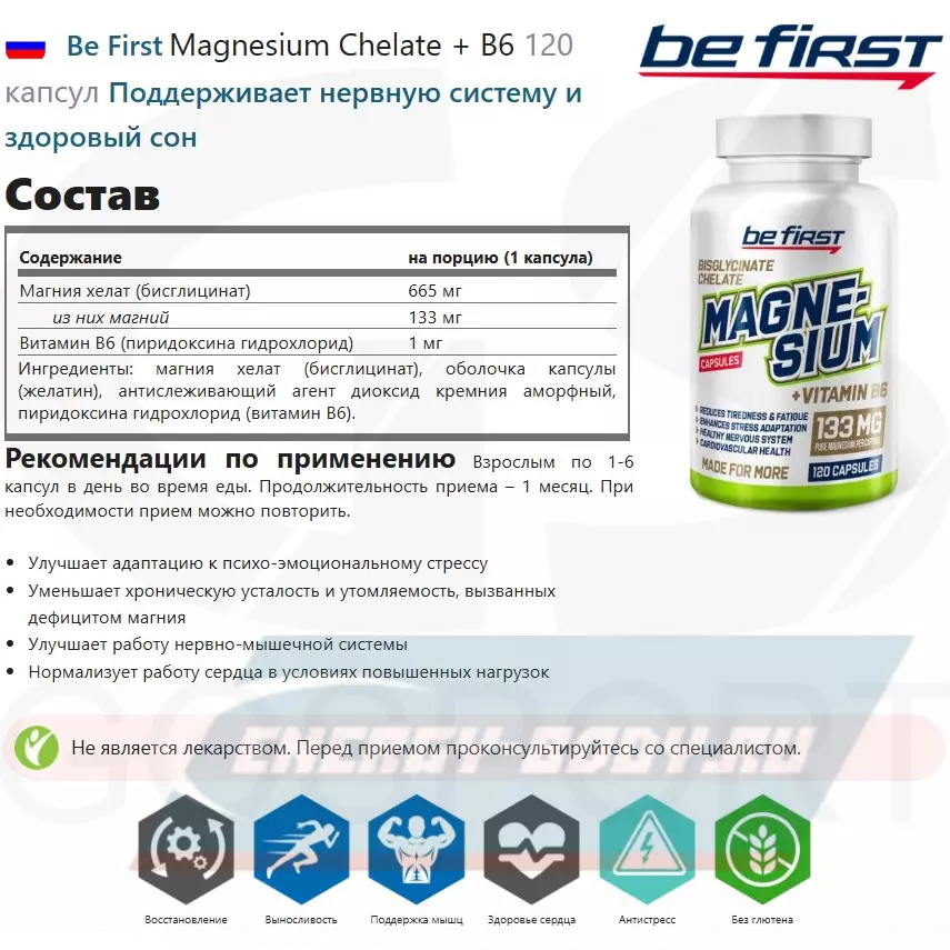 Витаминно-минеральный комплекс Magnesium Chelate + B6 от Be First защищает организм от стрессов и перенапряжения при интенсивных тренировках, восполняя запасы магния и витамина B6. Магний в капсулах поддерживает сердце и улучшает нейро-мышечную координацию, а пиридоксин (витамин B6) обеспечивает нормальную работу нервной системы, функции крови и синтез белка в мышцах.