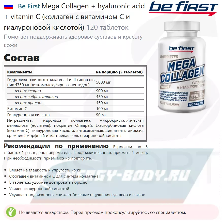 Состав Be First Mega Collagen + hyaluronic acid + vitamin C (коллаген с витамином С и гиалуроновой кислотой)