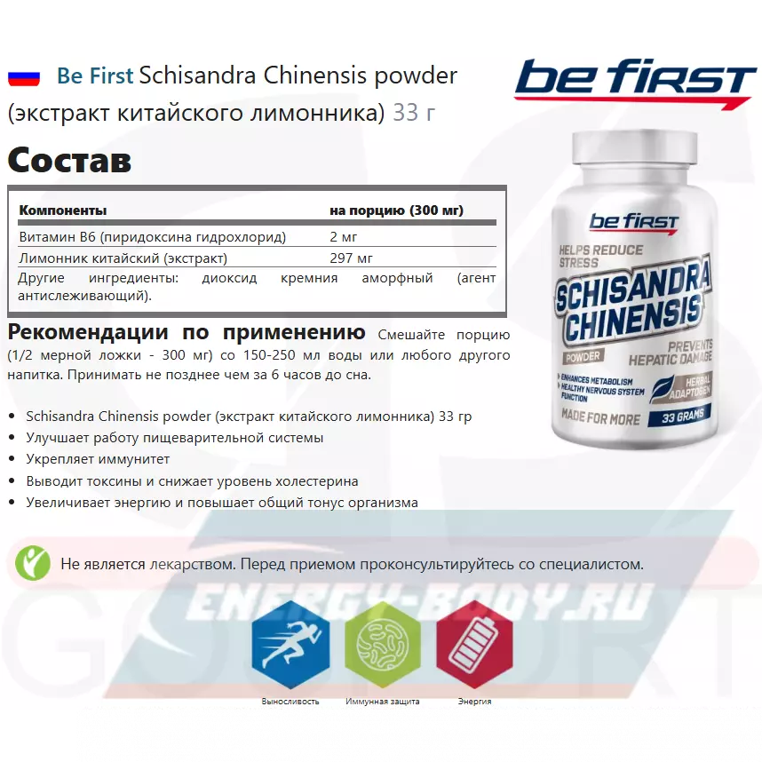 Продукт Be First Schisandra Chinensis Powder содержит в своем составе экстракт семян лимонника китайского. Лимонник китайский (Schisandra chinensis) веками использовался как растение традиционной китайской медицины. Его биологическая активность и фармакологическое применение связаны с дибензоциклооктадиен-лигнанами. Их активность была исследована в сотнях исследований, которые подтвердили адаптогенные эффекты, стимуляцию центральной нервной системы, гепатопротекторные эффекты и потенциальный противоопухолевый потенциал.