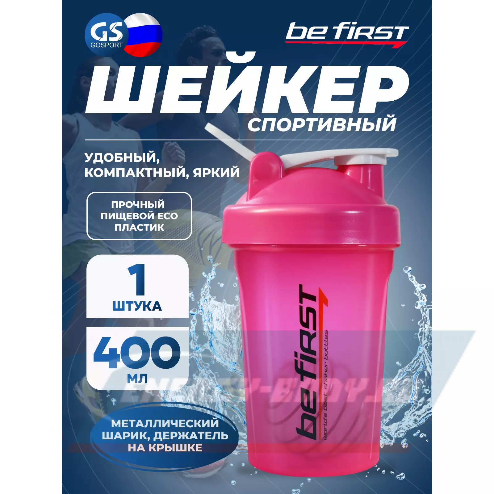 Пластиковый шейкер лучше подойдет для смешивания протеиновых или аминокислотных коктейлей: 400 мл – для этого оптимальный объем. Для изготовления шейкера Be First использует пищевой ECO пластик, не содержащий BPA и других вредных веществ. Обратите внимание – в наличии различные цвета!