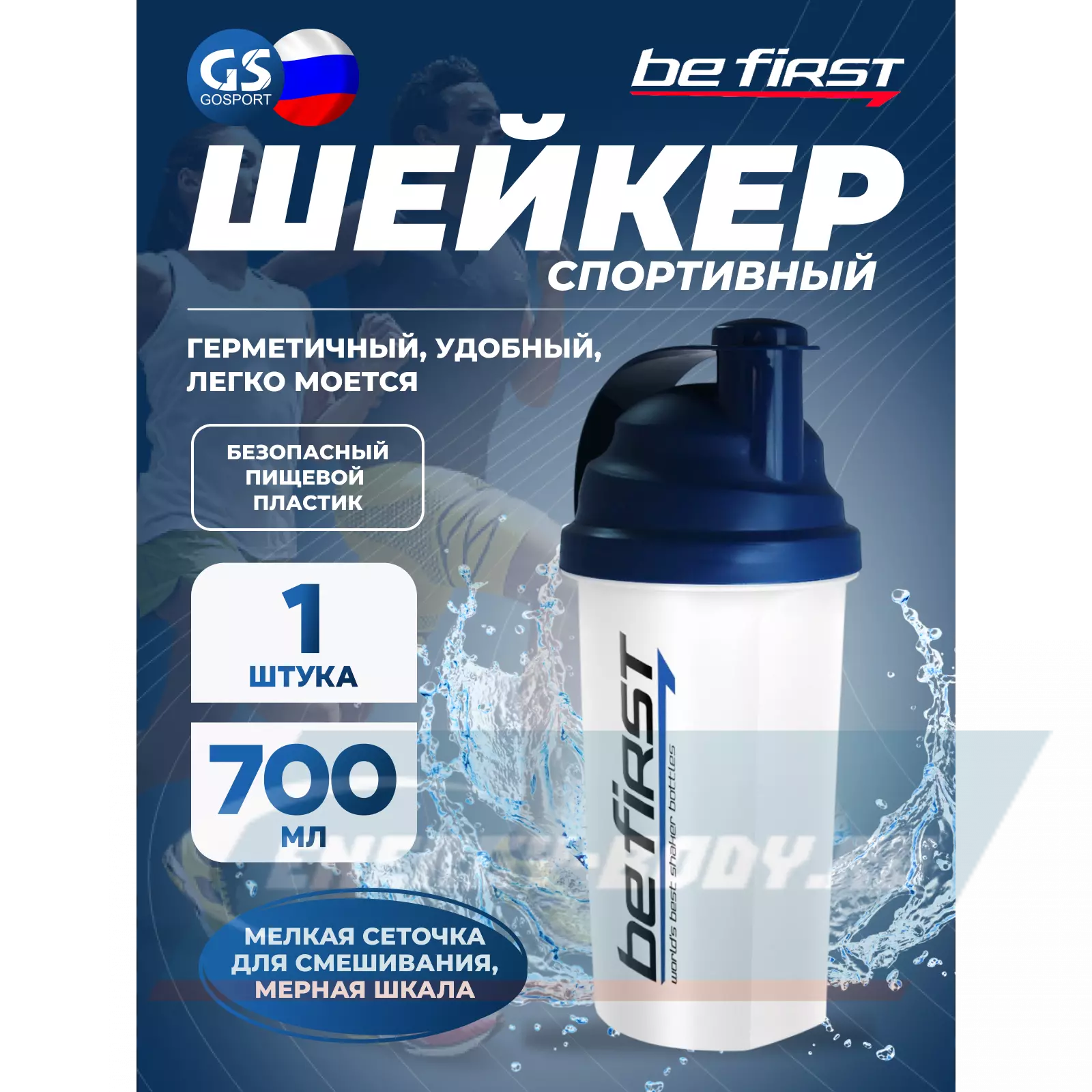 Практичный шейкер от Be First отличается целым рядом достоинств. Общий объем шейкера – 700 мл. Этого хватает, чтобы смешать практически любой спортивный напиток – креатин, карнитин, BCAA и другие аминокислоты, протеин и даже гейнер. Шейкер имеет небольшие размеры, его удобно держать в руке и мужчине и женщине. Объемная крышка позволяет смешивать коктейль даже при заполнении шейкера до максимума, поскольку остается свободное пространство, куда может во время смешивания перетекать жидкость.