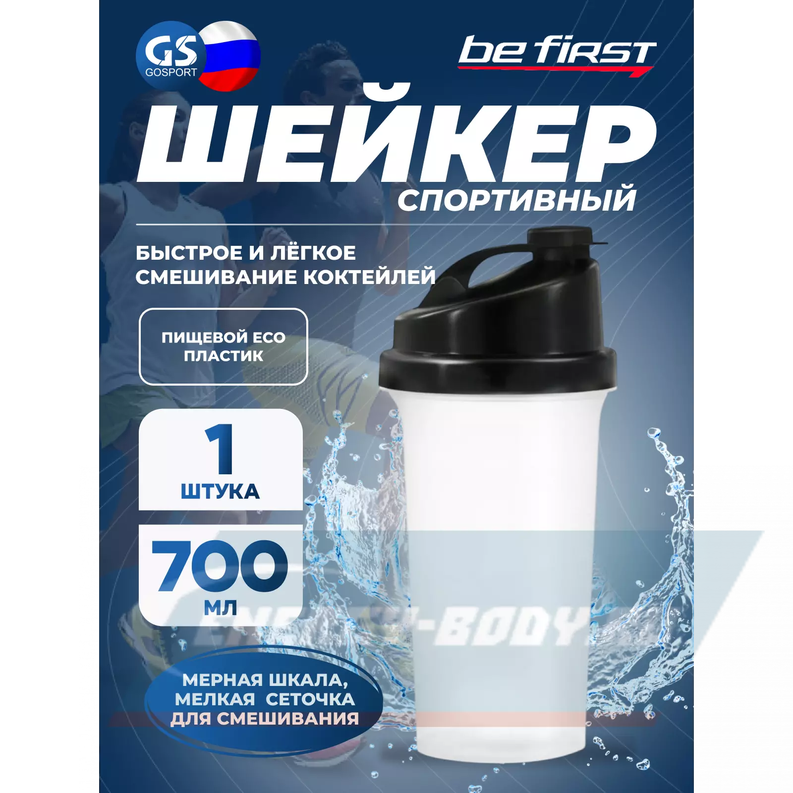 Шейкер Be First спортивный, объемом 700 мл, позволяет быстро и легко смешивать коктейли без лишних усилий. Не нужно тратить время на смешивание напитка в блендере и его последующее мытье - шейкер сделает это за вас. Изготовлен из пищевого ECO пластика, он неприхотлив, легко мыться и занимает мало места.