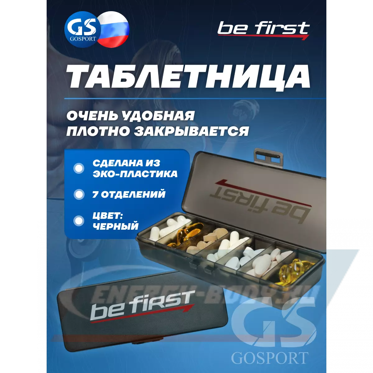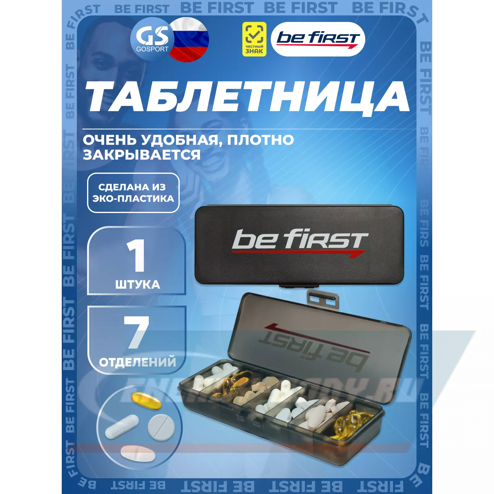 Таблетница компании Be First является очень удобным аксессуаром для всех, кто принимает различные препараты — витамины, лекарства, капсулированные добавки и т.п. В таблетнице их удобно взять с собой на тренировку или в поездку, зная, что ничего не рассыплется, не потеряется и не перепутается. Все таблетницы делаются из экологичного пищевого пластика BPA & DEHP FREE. Данная таблетница имеет внутри 7 отделений — можно взять 7 препаратов, или разделить один на 7 приемов, к примеру, по дням недели. Имеются черные, белые и прозрачные таблетницы. Крышка закрывается плотно и язычок удерживается двумя выступами, что исключает случайное открывание.