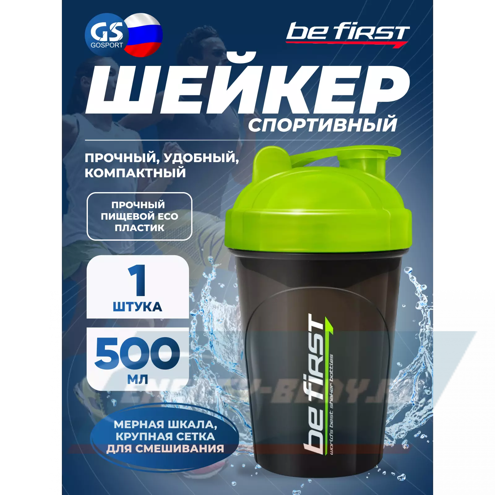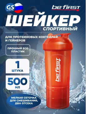 Компактный удобный спортивный шейкер Be First 500 мл прекрасно подойдет и для смешивания протеинового коктейля и для других целей. Удобный прозрачный корпус с мерными шкалами позволяет точно отмерить необходимое количество жидкости. Имеется 5 цветовых вариантов — крышки различных цветов, стакан из полупрозрачного темного (или бесцветного) пластика. Внутри отсутствуют выступы, поэтому мыть шейкер после использования будет несложно. Сеточка с крупными ячейками поможет хорошо размешать коктейль, разбив комочки.