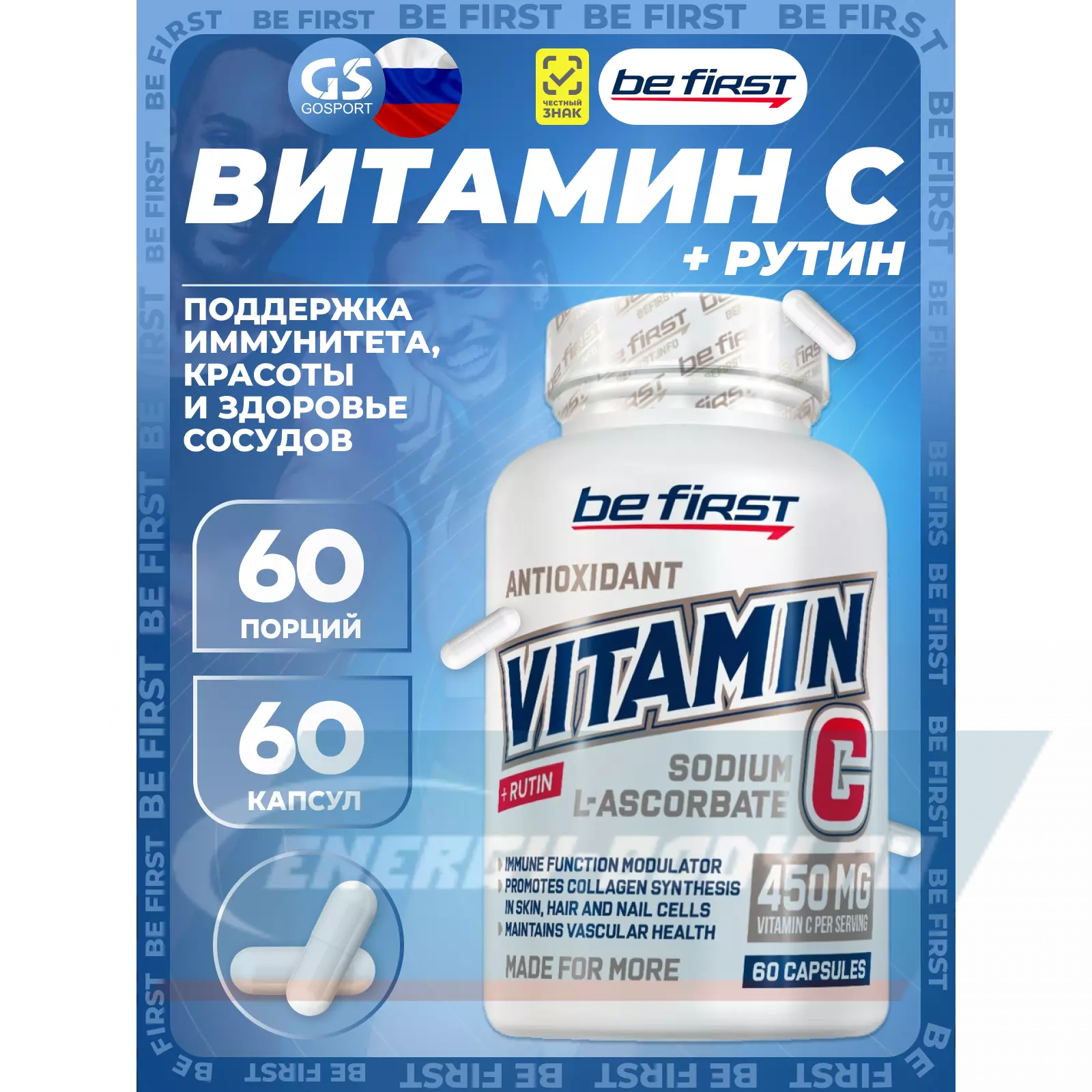Эффективный комплекс витаминов от Be First включает два ключевых антиоксиданта – витамин С, поддерживающий иммунитет, прочность и эластичность связок и суставов, кожи и сухожилий, сосудов и оболочек внутренних органов, а также рутин (витамин Р) – отвечающий за здоровье сосудов. Эти важнейшие витамины незаменимы для нормальной работы организма, для здоровья и активной физической деятельности. От ежедневного постоянного обновления и восстановления соединительной ткани и кровеносной системы зависит вообще вся жизнедеятельность человека. Нехватка витаминов С и Р нарастает малозаметно, но по итогу негативно влияет на функционирование организма, ухудшая состояние кожи, провоцируя растяжения связок, боли в суставах, нарушения циркуляции крови и замедляя все процессы – от отдыха и регенерации мышц до нервной активности. Противодействовать этому призван комплекс Vitamin C + Rutin, восстанавливающий оптимальный уровень рутина и аскорбиновой кислоты в крови.