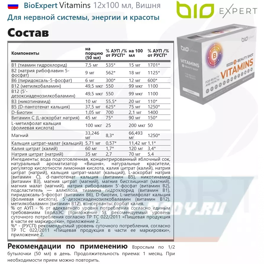 Ингедиенты: вода подготовленная, концентрированный яблочный сок, натуральный ароматизатор «Вишня», натуральные красители, регулятор кислотности лимонная кислота, калия цитрат (калий), натрия цитрат (натрий), кальция цитрат-малат (кальций), L-аскорбат натрия (витамин С), d-пантотенат кальция (витамин В5), никотинамид (витамин В3), магния цитрат (магний), магния бисглицинат (магний), магния малат (магний), натрия рибофлавин 5'-фосфат (витамин В2), подсластитель — аллюлоза, тиамина гидрохлорид (витамин В1), пиридоксаль-5-фосфат (витамин В6), D-биотин, L-метилфолат кальция (фолиевая кислота), 5'-дезоксиаденозилкобаламин (витамин В12), метилкобаламин (витамин В12), консерванты: сорбат калия.