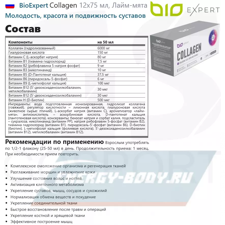 BioExpert Collagen 12x50 мл, Лайм-мята — Молодость, красота и подвижность суставов