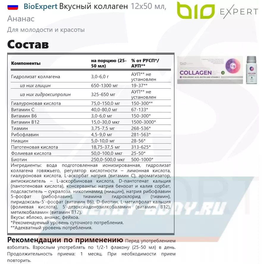 Коллаген с витамином С, биотином и гиалуроновой кислотой от BioExpert — это первый по-настоящему вкусный коллаген на рынке и результат кропотливой работы ведущего производителя инновационных спортивных нутрицевтиков и квалифицированной команды разработчиков во главе с известным врачом-неврологом и нутрициологом Владимиром Поповым (@detsdoc).