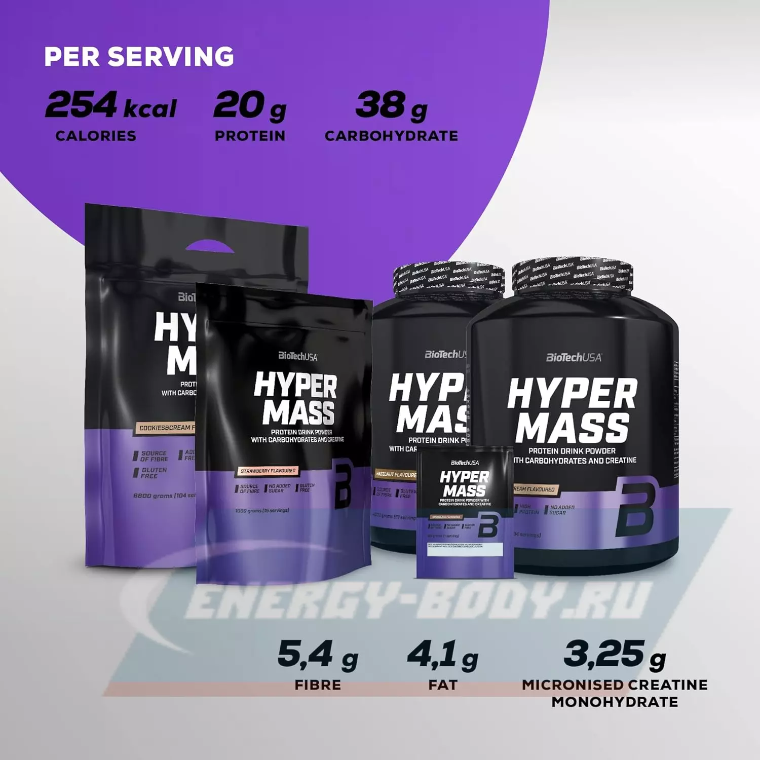 Высококалорийный гейнер Hyper Mass 5000 от BioTech USA восполнит потребности организма в белке, который способствует мышечному росту, а также обеспечит приток углеводов, поднимая уровень суточного потребления калорий. Разработан для тех, кому тяжело набирать массу. В каждой его порции также содержится 3250 мг креатина, который за счет воспроизводства АТФ увеличивает работоспособность организма.