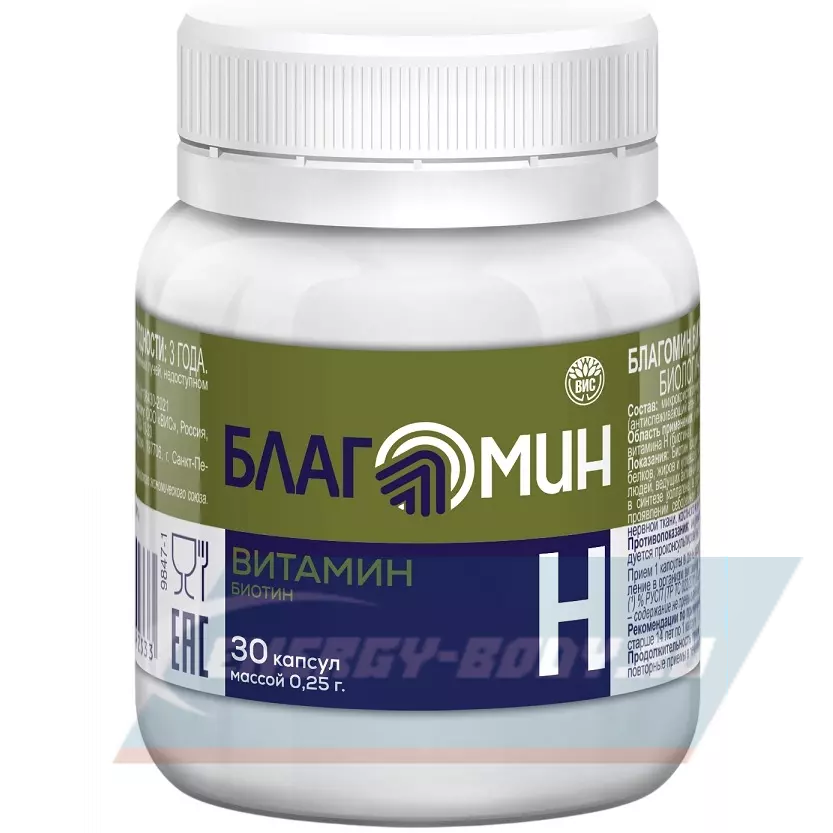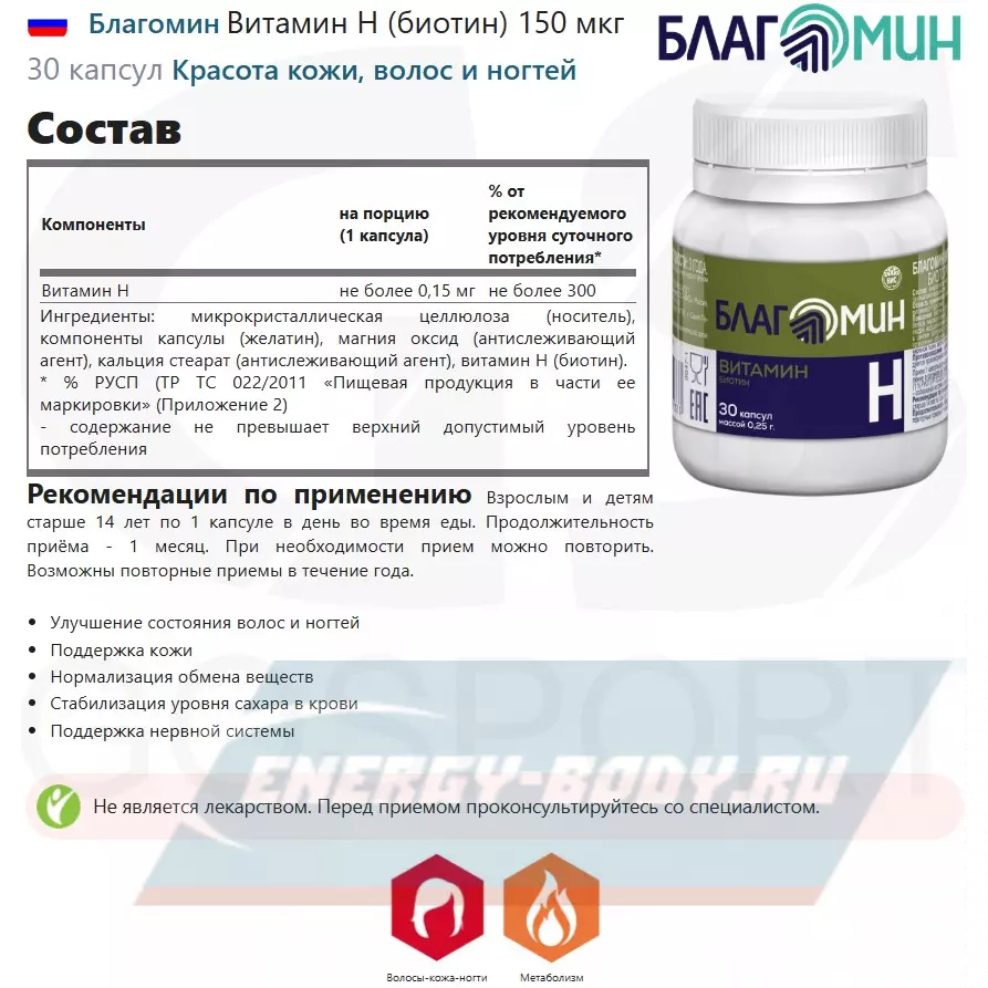 Благомин Биотин - дополнительный источник витамина Н. 1 капсула содержит 150 мкг биотина, что составляет 300 % от рекомендованного уровня суточного потребления и не превышает верхний допустимый уровень потребления.