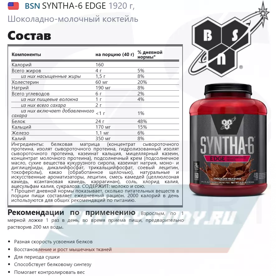 Syntha-6 EDGE от BSN – это протеин высокого качества для периода сушки. Он обладает превосходным вкусом. В его формуле присутствуют разные виды белков, которые налаживают подпитку мышц ценными нутриентами в течение долгого времени. Это все формы сывороточного белка, молочный концентрат, мицеллярный казеин, казеинат кальция, а также соевый белок. Каждый из названных протеинов по-своему полезен для организма, и не только за счет высокого уровня аминокислот. Их ценность состоит в том, что усваиваются они с разной скоростью.
