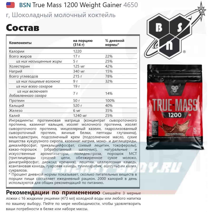 Использовать как добавку к вашему повседневному питанию, смешайте 2 мерные ложки TRUE-MASS 1200 с 480 мл. холодной воды или любого напитка на ваш вкус. Варируйте количество воды, чтобы достичь нужной вам консистенции. Принимайте 1 порцию в день или в соответствии с вашей потребностью в протеине или гейнере. Чтобы увеличить количество калорий и белка в порции и получить восхитительный вкус молочного коктейля, смешивайте с молоком. Не превышайте рекомендуемую дозировку. Продукт не должен использоваться, как замена полноценного питания. Прекратите прием продукта, если почувствуете отклонения от нормального состояния здоровья.