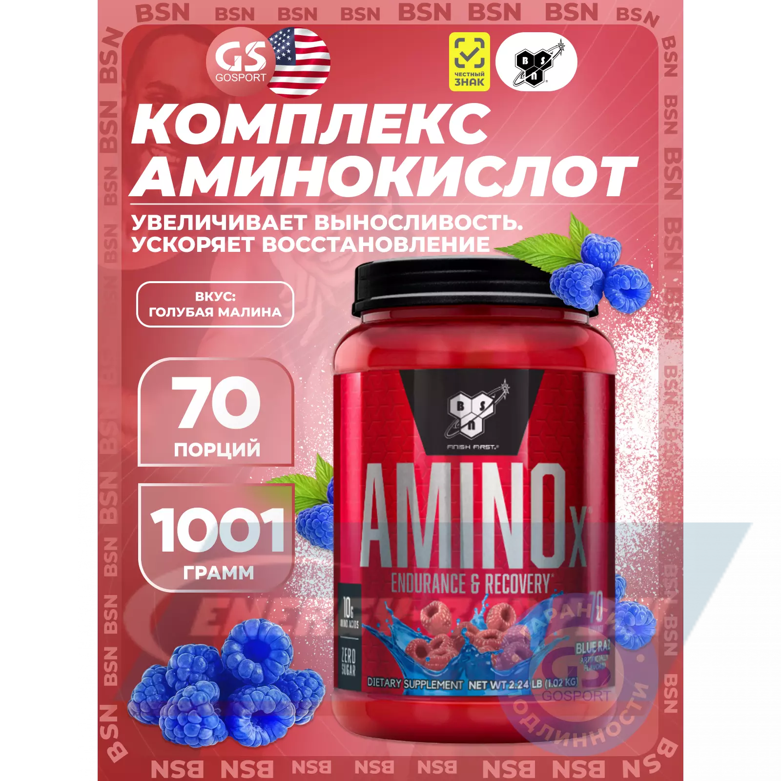 BSN Amino-X 2:1:1 1020 г, Голубая малина — Выносливость и восстановление
