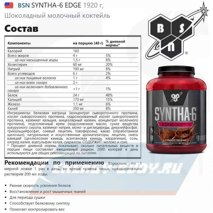 Syntha-6 EDGE от BSN – это протеин высокого качества для периода сушки. Он обладает превосходным вкусом. В его формуле присутствуют разные виды белков, которые налаживают подпитку мышц ценными нутриентами в течение долгого времени. Это все формы сывороточного белка, молочный концентрат, мицеллярный казеин, казеинат кальция, а также соевый белок. Каждый из названных протеинов по-своему полезен для организма, и не только за счет высокого уровня аминокислот. Их ценность состоит в том, что усваиваются они с разной скоростью.