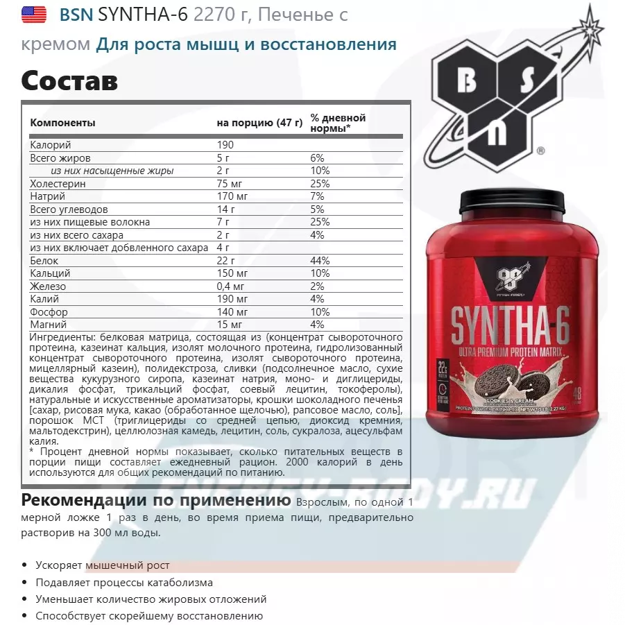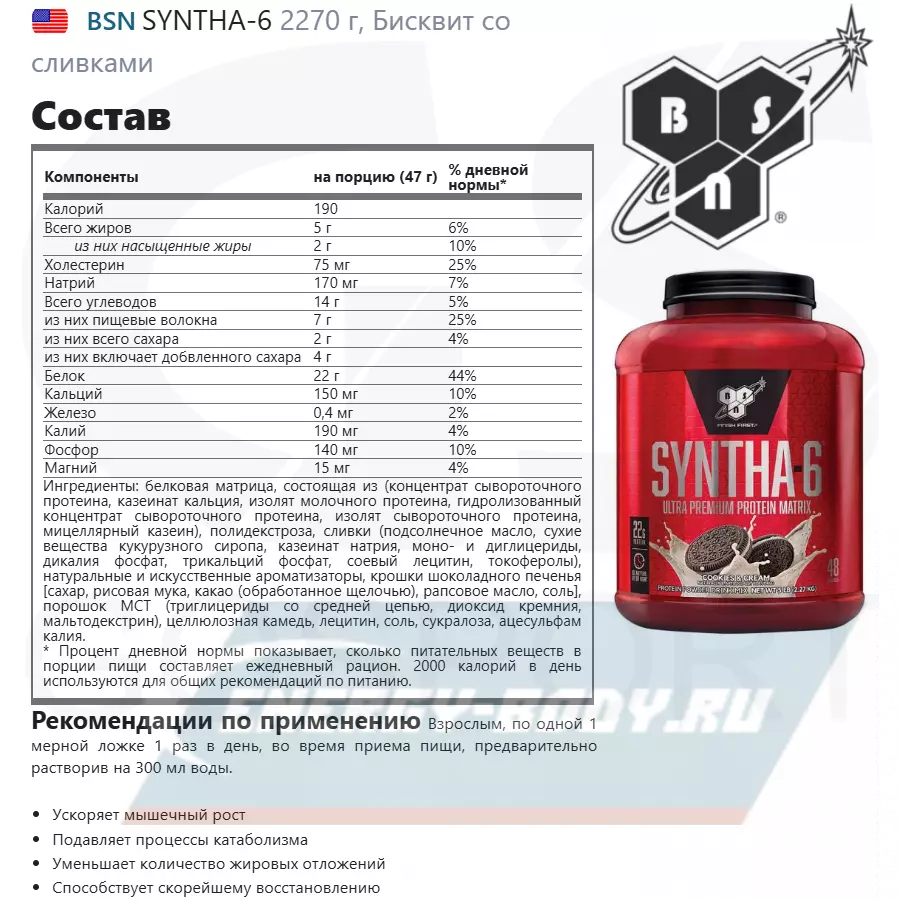 Использовать, как добавку к вашему повседневному питанию, смешайте 1 мерную ложку SYNTHA-6 с 120-150 мл. холодной воды или любого другого напитка на ваш выбор. Варьируйте количество жидкости, чтобы достичь нужного вам вкуса и консистенции. Принимайте в соответствии с вашей потребностью в протеине. Чтобы увеличить количество белка в порции и получить восхитительный вкус молочного коктейля, смешивайте продукт с нежирным или обезжиренным молоком. Не превышайте рекомендуемую дозировку. Продукт не должен использоваться, как замена полноценного питания. Прекратите прием продукта, если почувствуете отклонения от нормального состояния здоровья.
