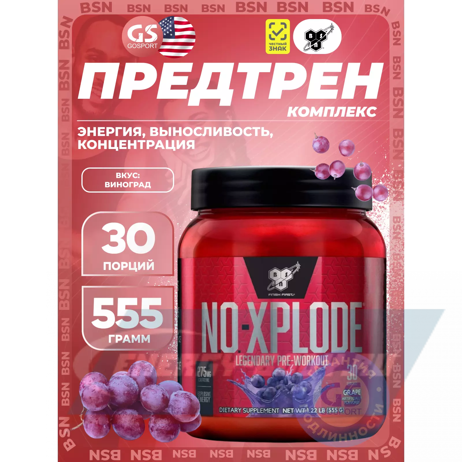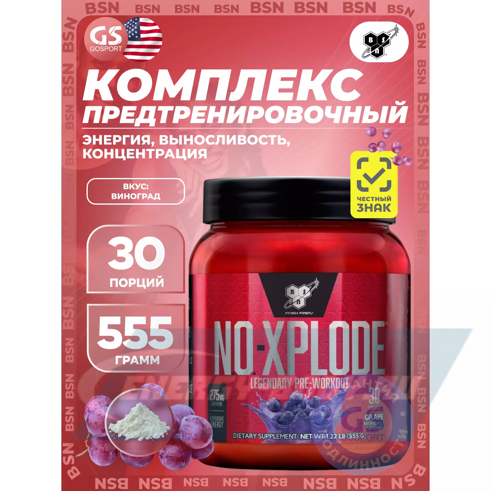 Для проведения наиболее эффективной тренировки необходимы, как ментальная, так и физическая энергия. Сосредоточенность нужна для контроля над энергией и управления сильной мышечно-мозговой связью. Эта мышечно-мозговая связь помогает достичь Вам большей интенсивности на тренировках и дает толчок организму к преодолению старых пределов. В BSN мы знаем, что предтренировочный комплекс должен обладать всеми этими возможностями. Мы разработали NO-XPLODE, полноценный предтренировочный комплекс, для помощи в получении большей энергии и выпосливости, поддержки мозгового центра и мышечной силы, а также чтобы дать вам непревзойденную интенсивность для достижения атлетами любого уровня максимальной работоспособности на тренировках.