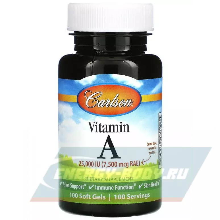 Vitamin A 25000 IU (7 500 мкг RAE) от Carlson Labs важен для здорового зрения. Он играет важную роль, помогая глазам адаптироваться к изменениям освещения. Витамин А также способствует здоровью кожи, костей и иммунной системы.